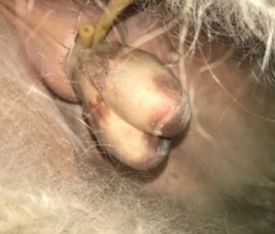Tetanus is caused by toxins produced by the gram-positive bacteria Clostridium tetani. It is found in soil but may also be present in the feces of domestic animals, especially horses. In the presence of oxygen, C. tetani produces “spores” that basically protect the bacteria with a hard outer layer and allow its survival in soil for years. These spores are resistant to many disinfectants and can even survive steam heat at 212°F for 20 minutes. If an open wound is contaminated with soil or feces, the spores of C. tetani will enter the site and germinate in environments where there is dead or rotten tissue and no oxygen (such as the scrotum after banding). This results in rapid growth and production of tetanus neurotoxin (TeNT) responsible for causing the clinical disease of tetanus or “lockjaw”. The toxin binds irreversibly to the nerve endings and travels back to the spinal cord, causing spastic paralysis.